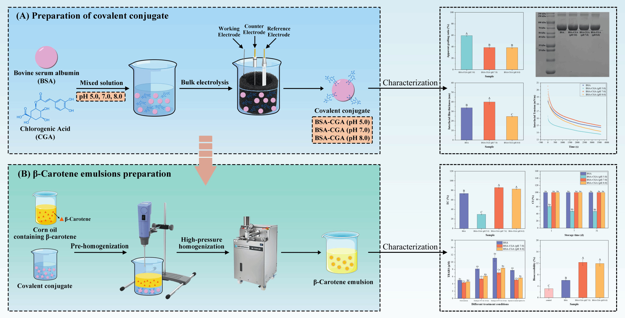 本研究采用电化学氧化方法,在不同pH条件下制备了牛血清白蛋白-绿原酸共价加合物,并系统研究了其界面行为及对β-胡萝卜素乳液稳定性的影响。结果表明,制备体系pH值对加合物的结构与功能具有显著调控作用。其中,在中性条件(pH 7.0)下制备的加合物综合性能最佳,不仅具有适中的疏水性和较快的界面扩散能力,还可形成更厚的界面吸附层(约40 nm),从而显著减小乳液液滴尺寸、增强乳液界面稳定性,并提高乳液在离子强度、热处理和不同pH环境下的稳定性。与此同时,该加合物还能有效抑制脂质氧化和β-胡萝卜素降解,提高β-胡萝卜素的生物可及性,表现出优异的抗氧化保护作用。这些发现为蛋白-多酚抗氧化乳化剂的理性设计提供了新思路,并为脂溶性活性物质递送体系构建及功能食品开发提供了理论参考。