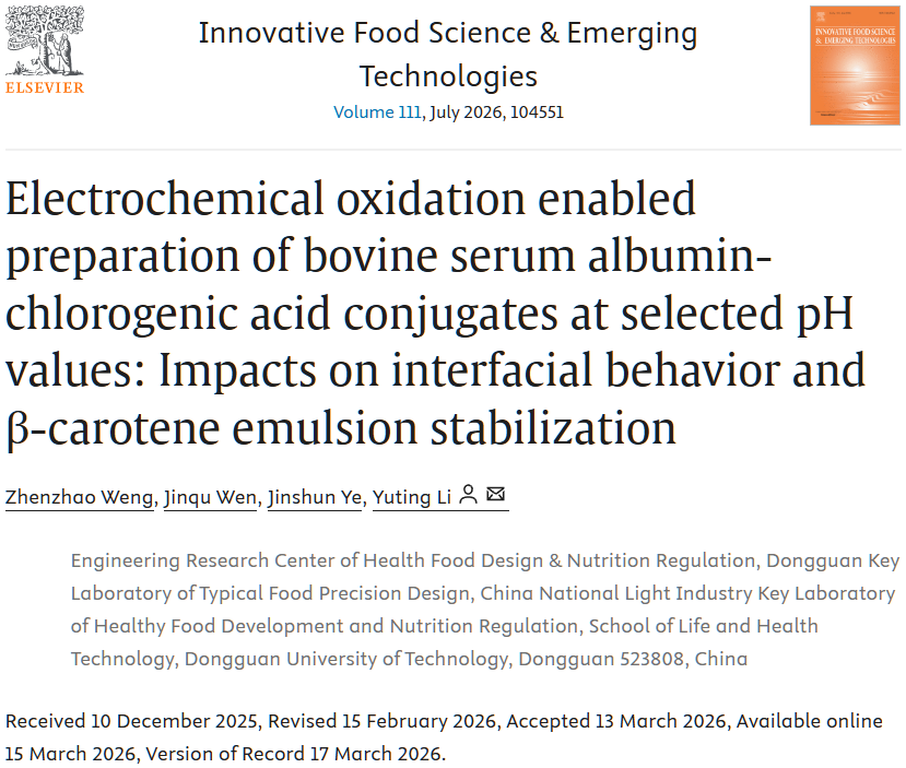 2026年3月,我院硕士研究生翁振钊以第一作者身份于国际食品顶级期刊《Innovative Food Science & Emerging Technologies》(IF:6.8)发表题为“Electrochemical oxidation enabled preparation of bovine serum albumin-chlorogenic acid conjugates at selected pH values: Impacts on interfacial behavior and β-carotene emulsion stabilization”的研究性文章。我院李玉婷特聘教授为该论文通讯作者。